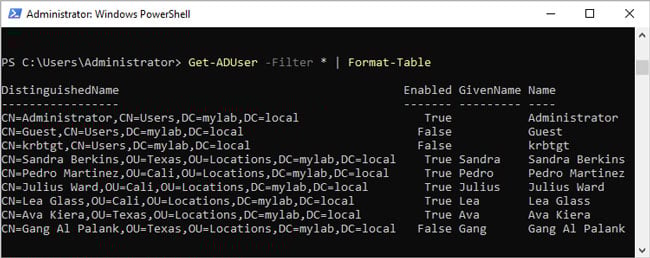 これらの演算子とプロパティを使用して、さまざまな種類のフィルタを作成できます。たとえば、説明に Tech が含まれるユーザーのみを取得するには、Get-ADUser-Filter”Description-like’Tech'”を使用できます。アクティブな AD ユーザーのみを一覧表示するには、Get-ADUser-Filter’Enabled-eq $true’を使用します。