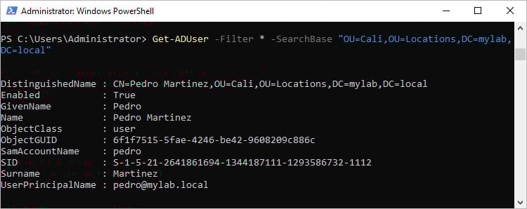Get-ADUser-Filter *-SearchBase”OU=Cali,OU=Locations,DC=mylab,DC=local”