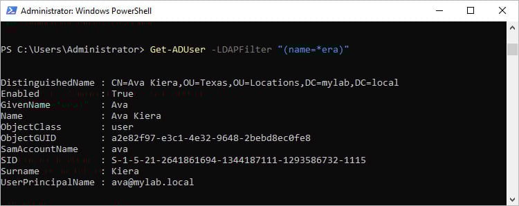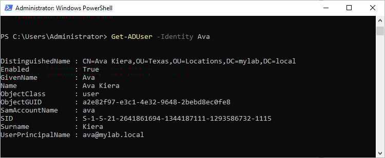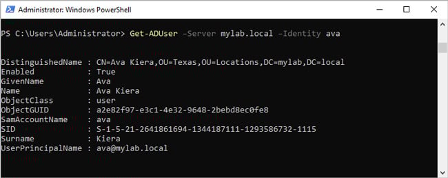 Ava という名前のユーザーの詳細が必要だとしましょう。彼女の SamAccountName が ava であると仮定すると、Get-ADUser-Identity ava でユーザー オブジェクトを取得できます。