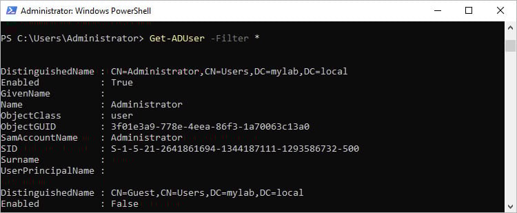 もう 1 つの便利なコマンドは、すべての AD オブジェクトを取得する Get-ADUser-Filter * です。