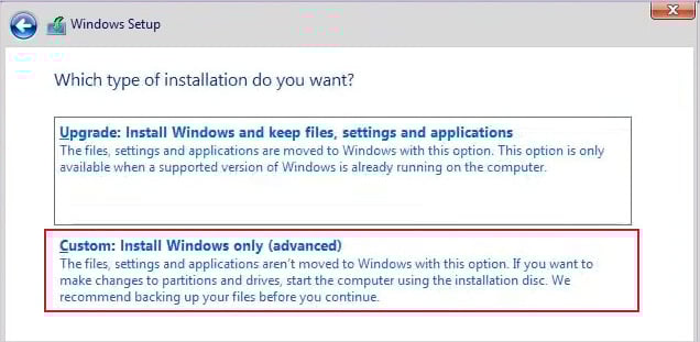 [どのタイプのインストールを行いますか?] 画面が表示されたら、[カスタム: Windows のみをインストールする (詳細)] を選択します。