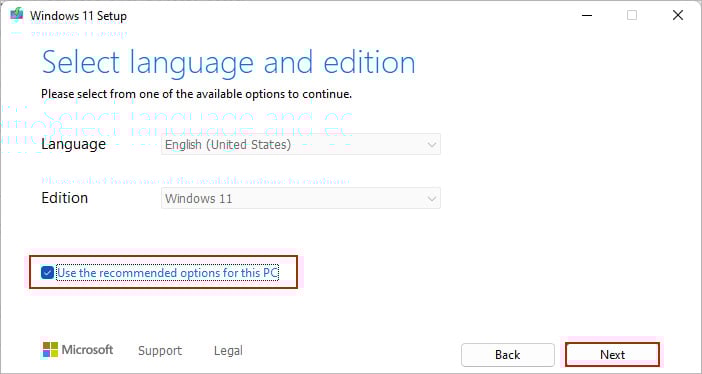 次に、優先する Windows 11 バージョンを選択します。 [この PC に推奨されるオプションを使用する] を選択して、サポートされている OS バージョンをインストールします。
