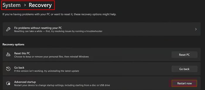 Windows + I を押して設定アプリを開きます。 システム > 回復 に移動します。 [回復オプション] セクションまで下にスクロールします。 [高度なスタートアップ] の横にある [今すぐ再起動] ボタンをクリックし、プロンプトが表示されたら [今すぐ再起動] をクリックします。
