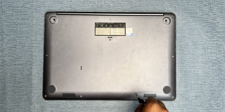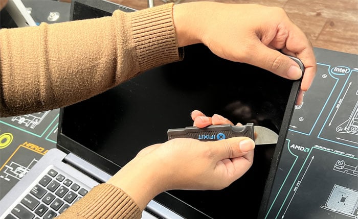 ラップトップの画面部分に小さなステッカーやゴム製の円/四角が含まれている場合は、ネジが隠れています。したがって、それらを取り出して画面のネジを外す必要があります。次に、継ぎ目にこじ開けツールを使用して、画面ベゼルをそっと飛び出します。