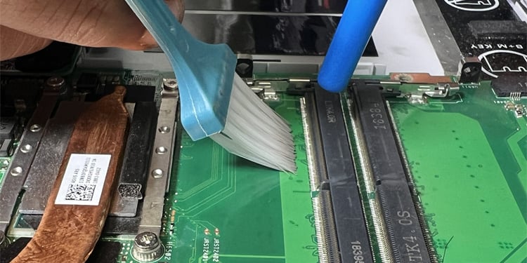 スロットを掃除する圧縮空気または ESD ブラシを使用した RAM。
