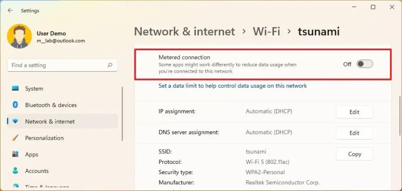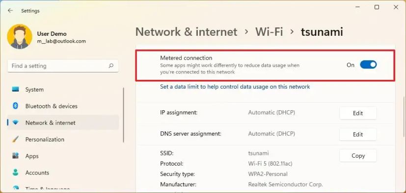 手順を完了すると、アクティブなネットワーク接続が従量制として構成され、Windows 11 とアプリのデータ使用が制限され、サブスクリプションの追加料金が発生しなくなります。