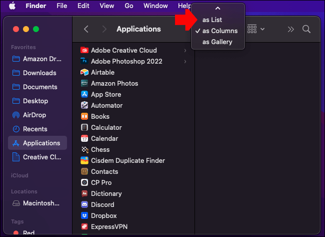 アプリケーション フォルダにあるインストール済みアプリのリストを開きます。[リスト] ビューになっていることを確認してください。