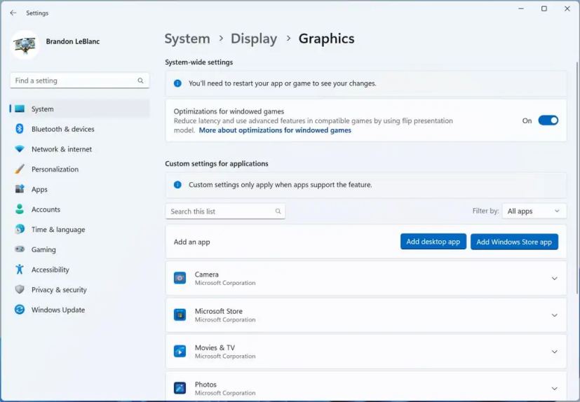 グラフィック設定ページも、設定アプリ全体のデザインに合わせて視覚的に変更されています。ただし、すべてが同じままであるため、機能は以前のバージョンの変更から変更されません。ただし、「ウィンドウ ゲームの最適化」オプションは、別のページではなくメイン ページに表示されるようになりました。