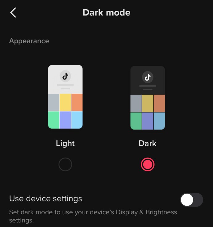 TikTok がダーク モードとライト モードのシステム設定に従うようにする場合は、手順 5 で [ダーク モード] をタップする代わりに [デバイス設定を使用] をタップします。これは、[ライト] オプションと [ダーク] オプションのすぐ下にあります。有効にすると、TikTok のインターフェースは携帯電話の外観に応じて 2 つのモードを交互に切り替えます。