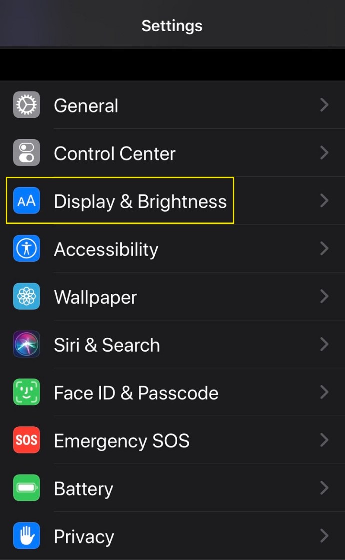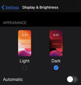 [表示と明るさ] をタップします。画面の上部にある >外観 セクションでは、ライトとダークのオプションに気付くでしょう。 [ダーク] をタップして有効にします。