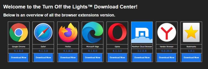 お気に入りのブラウザで Turn Off the Lights ダウンロード センターを開きます。この拡張機能がサポートする各ブラウザーのダウンロード リンクを取得するページ。お使いのブラウザーに適したものをクリックしてください。使用しているブラウザーに応じて、リンクは専用のダウンロード ページに移動するか、開始します。インストールファイルのダウンロード。また、ブラウザのセキュリティ設定によっては、ファイルのダウンロードを手動で承認する必要がある場合があります。