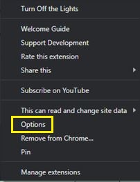 Turn Off the Lights extension を右クリックします。 > ブラウザのアイコン。オプションをクリックします。