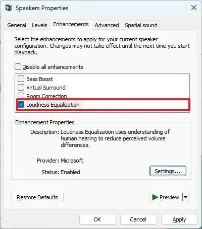 「ラウドネス イコライズ」をチェックします。 Windows 11 で音量を正規化するオプション。