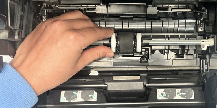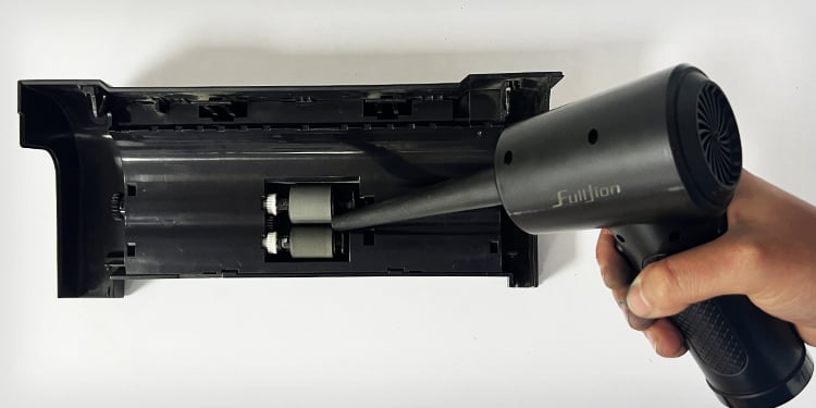 同じ布を使用してローラーをクリーニングします。異物が付着している場合は、つまようじやブロワーを使用してきれいにすることもできます。ローラーがスムーズに動くまで、ローラーのクリーニングを続けます。クリーニングが完了したら、給紙トレイを元に戻し、ネジで固定します。