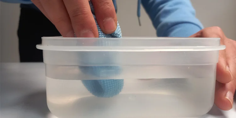 糸くずの出ない布を浸します蒸留水の容器。”width=”750″>