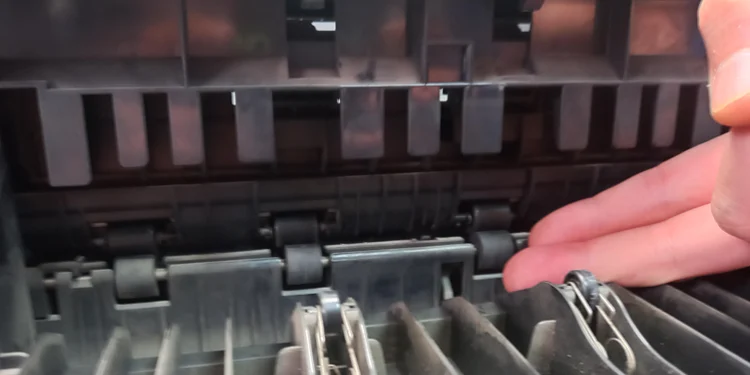 ADF アセンブリの上部カバーを取り外します。上部カバーに取り付けられた 2 つの車輪と、用紙経路に 2 つの車輪が付いたローラー スティックが表示されます。つまようじを使ってゴミを取り除くか、ブロワーを使ってゴミを吹き飛ばします。