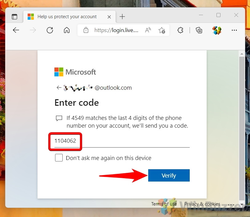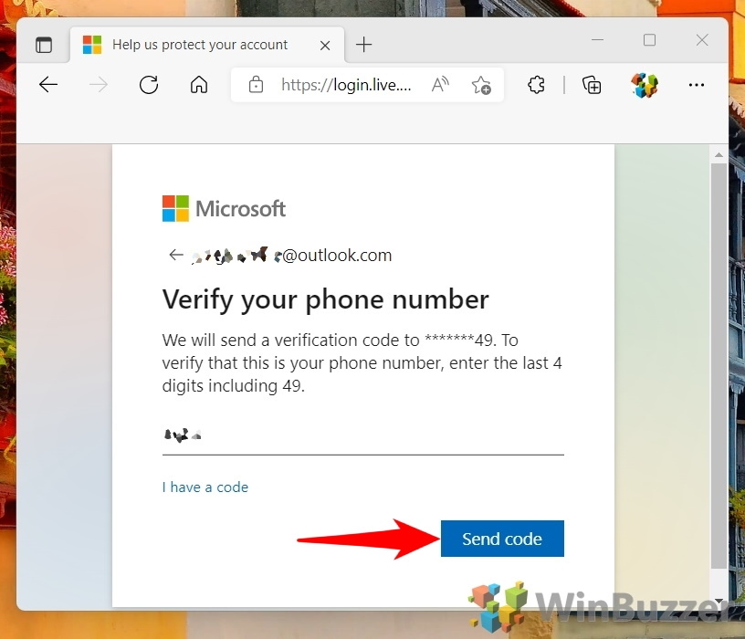 必要に応じてメール アドレスまたは電話番号を確認し、[コードを送信] をクリックします