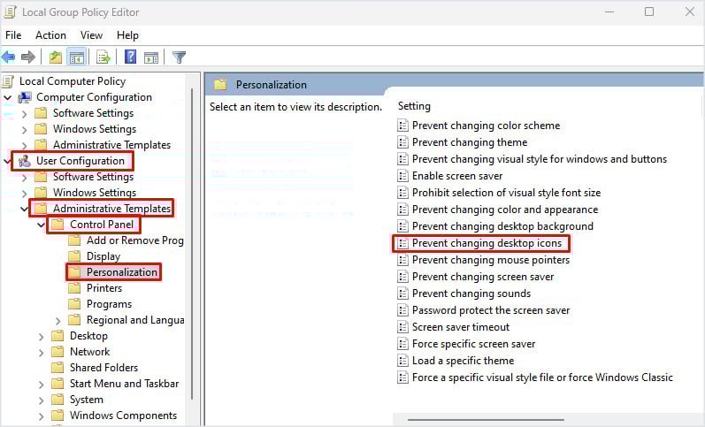 Pada panel kanan, navigasi ke Konfigurasi Pengguna > Templat Pentadbiran > Panel Kawalan > Pemperibadian. Pada panel kanan, klik dua kali pada Halang menukar ikon desktop.