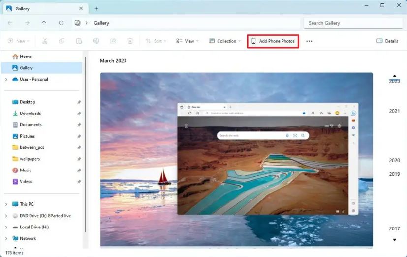 Ia membina paparan “Galeri” baharu yang memperkenalkan cara baharu untuk melihat imej menggunakan pengalaman yang serupa dengan apl Foto, melihat pratonton imej dengan lakaran kecil yang lebih besar, menyembunyikan nama fail dan menggunakan pengisihan kronologi. Pada halaman baharu, anda boleh menggunakan pilihan”Urus Lokasi”daripada”Koleksi””untuk menambah atau mengalih keluar folder dengan imej. Tetapan lalai hanya menunjukkan kandungan folder”Pictures”.