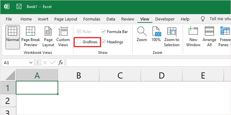 Buka lembaran kerja anda. Pergi ke Lihat dari bar menu di atas reben.Nyahpilih kotak di sebelah Gridlines dalam bahagian Tunjukkan dalam reben Lihat.