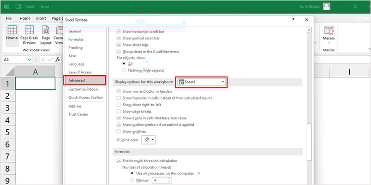 Pilih Lanjutan daripada tetingkap Excel Options. Cari bahagian Paparan untuk lembaran kerja ini dan pilih menu lungsur untuk memilih tempat anda mahu perubahan ini.