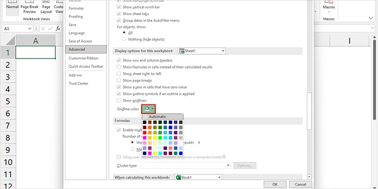 Excel menawarkan ciri tambahan untuk menyesuaikan garis grid anda dengan menukar warnanya. Anda boleh menukar isian warna kepada putih daripada pilihan Excel lanjutan.