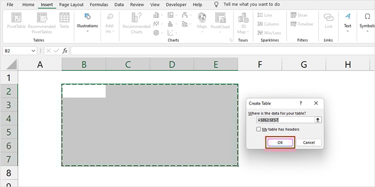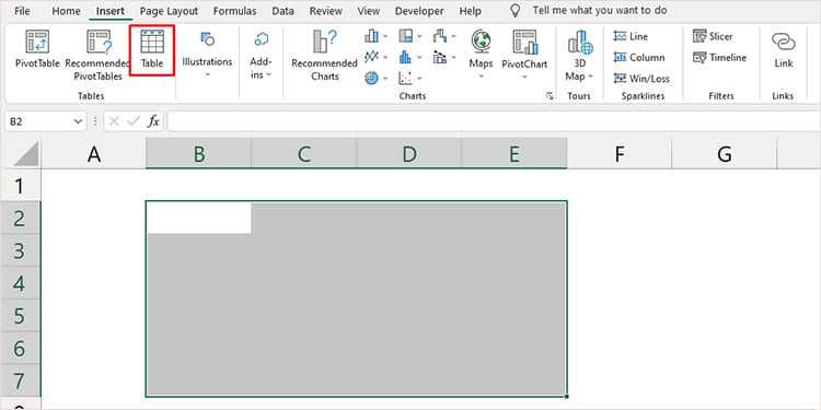 Buka buku kerja anda. Serlahkan bahagian yang anda ingin masukkan jadual andaKepala ke tab Sisipkan daripada bar menu.Pilih Jadual daripada reben.