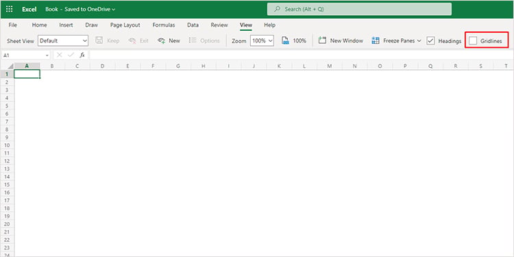 Buka penyemak imbas anda dan navigasi ke Office Online.Jika anda belum melakukannya, log masuk ke akaun Microsoft anda.Buka buku kerja anda.Dari helaian, pergi ke Lihat dari bar menu.Nyahpilih kotak di sebelah Gridlines di sebelah kiri paling kiri reben Lihat.