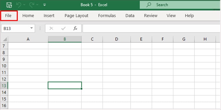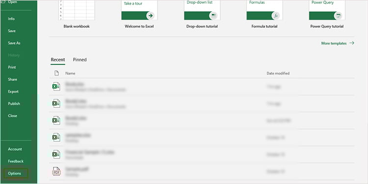 Lancarkan Excel untuk membuka buku kerja anda. Daripada bar menu, pilih Fail.Kepala ke Pilihan dari bar sisi. Jika anda tidak melihatnya, pergi ke Lagi > Pilihan.
