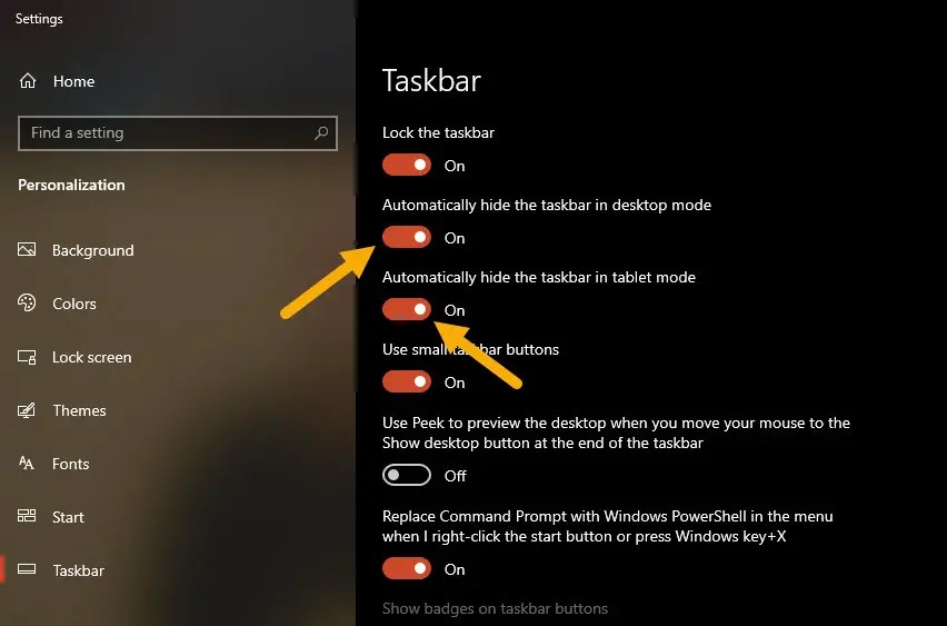 Langkah-langkah terperinci (dengan tangkapan skrin) Untuk melakukan itu, klik kanan di ruang kosong pada bar tugas dan pilih pilihan” Taskbar “. Sebagai alternatif, anda juga boleh membuka aplikasi Tetapan dengan menekan”Windows Key + I”pintasan, dan pergi ke halaman”Peribadi”>”Taskbar”. Mulai sekarang, bar tugas tidak akan muncul di skrin. Untuk menunjukkan atau tanpa bar tugas, gerakkan penunjuk tetikus ke bahagian bawah skrin. Untuk menyembunyikannya lagi, gerakkan penunjuk tetikus dari bar tugas. Editor. mulakan semula komputer anda. Dengan itu, anda telah tersembunyi bar tugas di Windows 10 .
