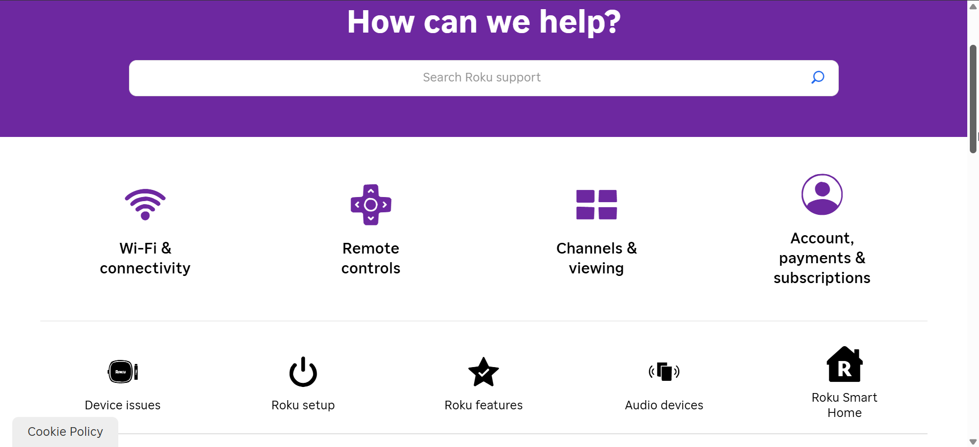 Portal Sokongan Roku adalah cara yang paling cepat dan paling dipercayai untuk mencapai perkhidmatan pelanggan. Ia membimbing anda melalui kategori isu supaya anda mendapat bantuan yang betul tanpa menunggu ditahan. Pilih kategori yang sepadan dengan isu anda, seperti persediaan peranti, akses akaun, atau pengebilan. Bergantung pada pilihan anda, Roku memaparkan langkah penyelesaian masalah atau pilihan sembang langsung dengan ejen.