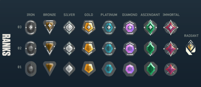 IronBronzeSilverGoldPlatinumDiamondAscendantImmortalRadiant (voorheen”Valorant”genoemd)