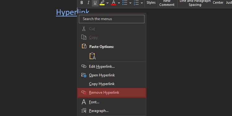 Opmerking: Als u de tekst wilt behouden, maar niet de link, gebruik dan Hyperlink verwijderen door met de rechtermuisknop op de link te klikken. Maar als u het volledig wilt verwijderen, selecteert u gewoon de hyperlink en drukt u op de delete-of backspace-toets.