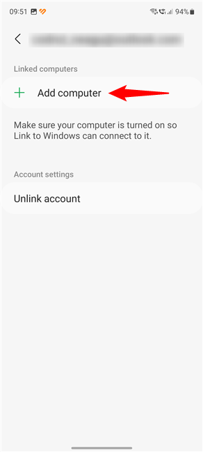 U kunt ook de app Instellingen openen, op Verbonden apparaten tikken en de schakelaar Koppelen aan Windows. Tik vervolgens op Koppelen aan Windows om naar de configuratiepagina te gaan en tik op Aanmelden om computer toe te voegen.