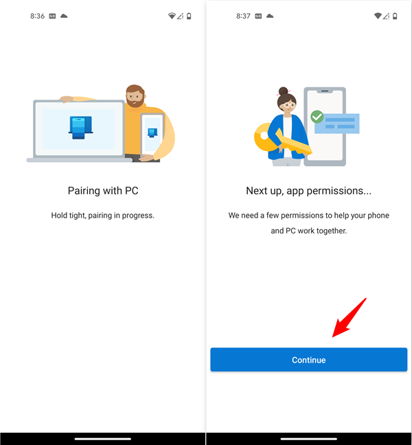 Nu u bent gestart de Link to Windows-app, zou je een scherm moeten zien zoals dat aan de linkerkant van de volgende schermafbeelding. Tik onderaan op de knop’Je telefoon en pc koppelen’en tik vervolgens op Doorgaan op het volgende scherm.