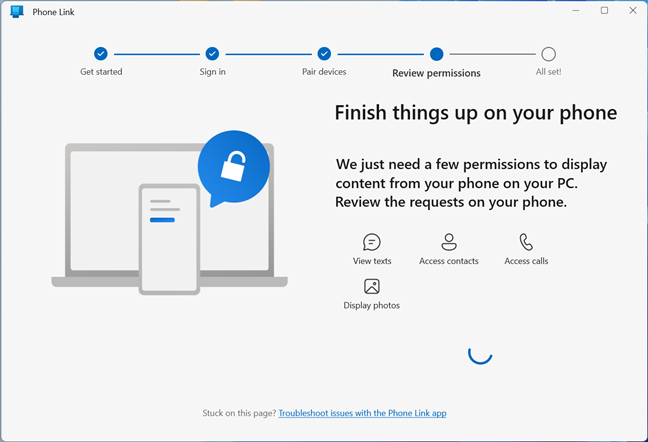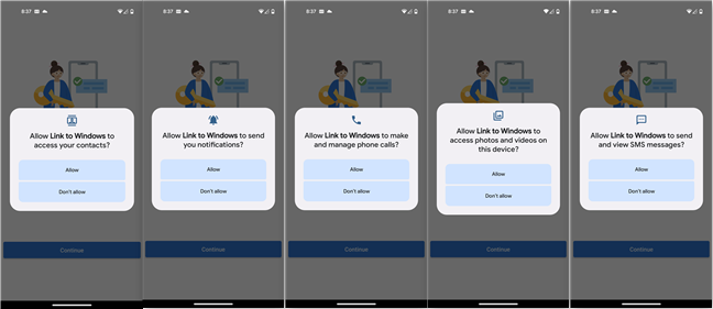 Na het scannen van de code informeert Link to Windows u dat het nu wordt gekoppeld met pc. Vervolgens laat het je weten dat je het”[…] een paar machtigingen moet geven om je telefoon en pc te laten samenwerken.”Tik op Doorgaan.