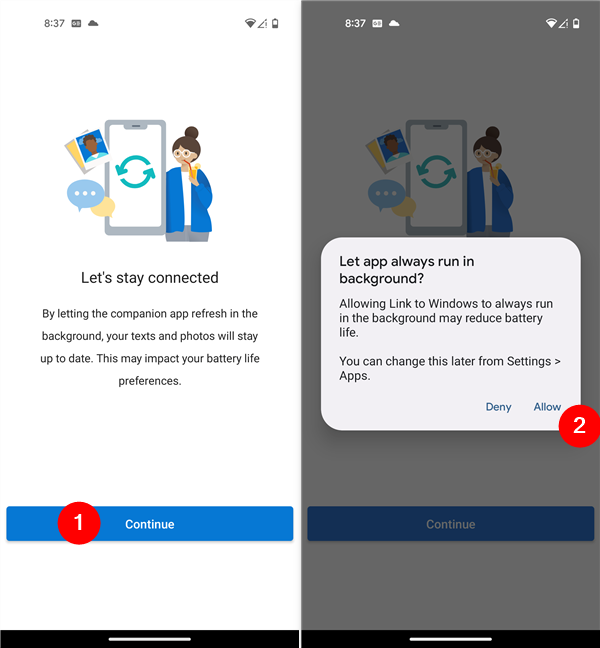 Er is nog een machtiging vereist, een waarmee de app te allen tijde met uw Windows-pc kan worden gesynchroniseerd. Tik op Doorgaan en u kunt dit op het volgende scherm toestaan.
