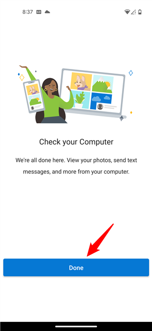 Zodra u het bericht”Uw telefoon en pc zijn gekoppeld”op het scherm ziet, is uw Android klaar voor gebruik.
