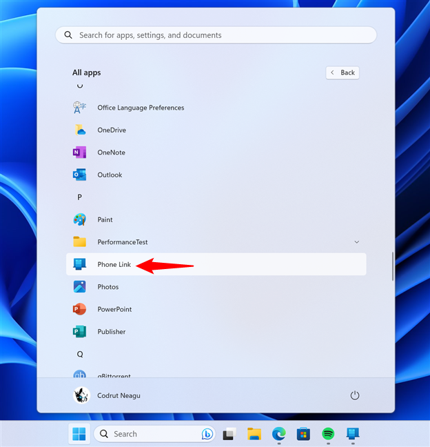 Eerst moet u de Phone Link-app op uw computer openen. Een van de gemakkelijkste manieren om dat te doen, is door de snelkoppeling van het menu Start te gebruiken. In Windows 11 moet u de lijst Alle apps openen, scrollen tot u bij de letter P komt en vervolgens op Telefoonlink klikken of tikken.