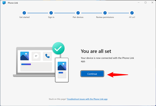 En nu dat klaar is, zou je een bericht moeten zien dat”Je bent helemaal klaar”en dat”Je apparaat is nu verbonden met de Phone Link app.”Daaronder bevindt zich een knop Doorgaan: klik of tik erop.
