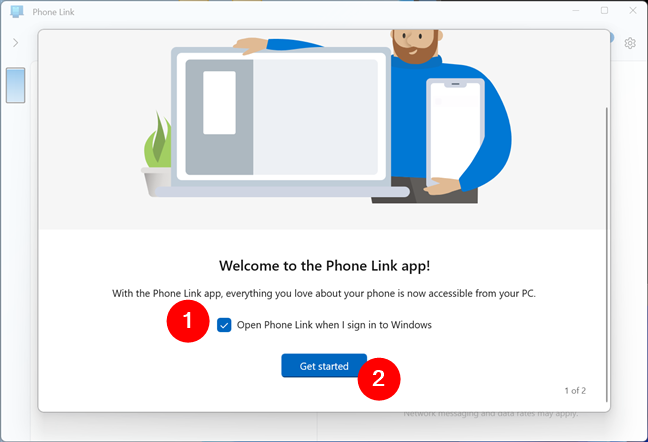 Vervolgens heb je de optie”Telefoonlink openen wanneer [je] inlogt bij Windows”door aan te vinken de juiste doos. Vink het vakje aan als u wilt dat uw Windows-pc en Android-telefoon worden gekoppeld elke keer dat u uw pc opstart en klik of tik vervolgens op Aan de slag om uw smartphone op uw computer te gebruiken.