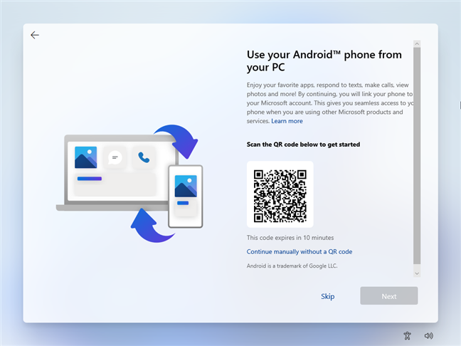 Wanneer je Windows 11 of Windows 10 installeert, maar ook wanneer je een upgrade uitvoert naar de nieuwste versie van Windows, krijg je de mogelijkheid om je smartphone en pc te koppelen. Wanneer u het onderstaande scherm ziet, gebruikt u de camera van uw Android-telefoon om de QR-code te scannen. Druk vervolgens op Volgende om verder te gaan met het installatieproces.