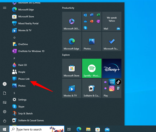 Als u Windows 10, open het menu Start en blader door de lijst met apps aan de linkerkant tot je bij de letter P komt. Dan zou je de snelkoppeling Phone Link moeten zien: klik of tik erop.