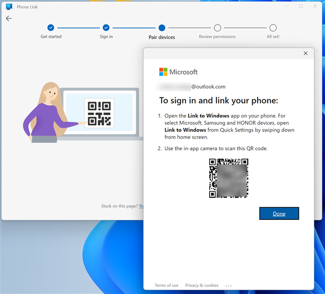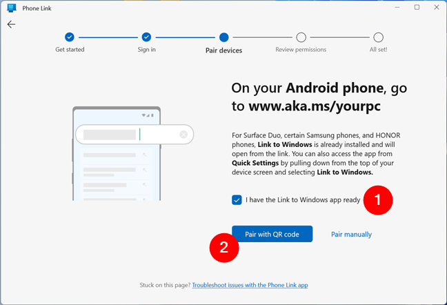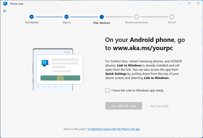 Vink de”I have the Link to Windows app ready”aan vak en druk op de knop”Koppelen met QR-code”.