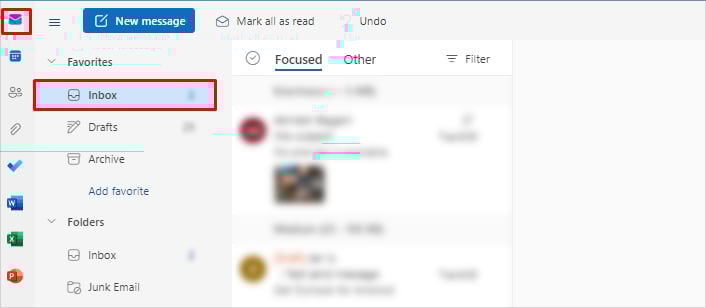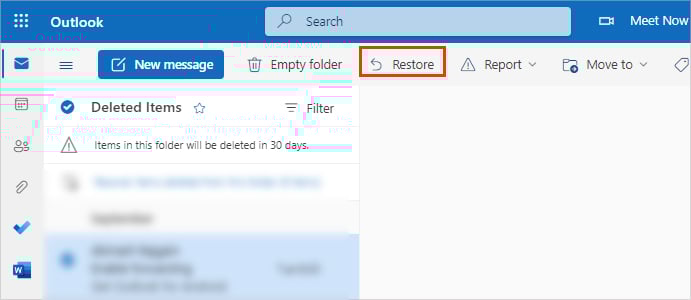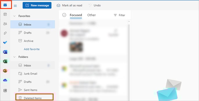 Open een browser en log in op uw Outlook-account.Klik op het pictogram Mail in de linkerbovenhoek. Selecteer vervolgens onder de vervolgkeuzelijst Map Verwijderde items in de zijbalk.