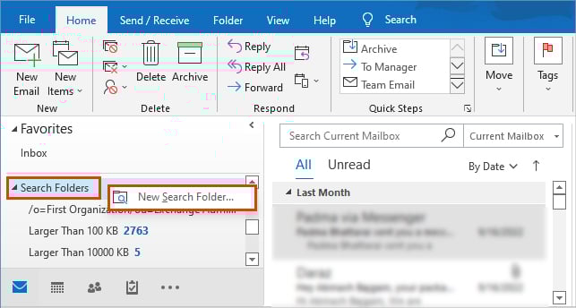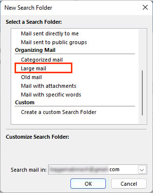op het tabblad Start, selecteer het pictogram E-mail. Klik vervolgens in het rechterdeelvenster met de rechtermuisknop op Zoekmappen en selecteer Nieuwe zoekmap.In de prompt Nieuwe zoekmap, scrol naar het gedeelte E-mail ordenen en klik op de optie Grote e-mail.
