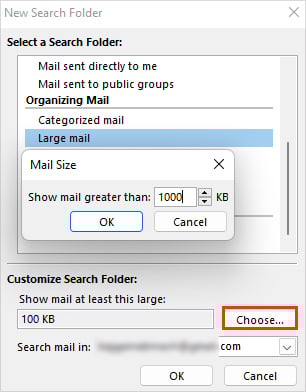 Als u meerdere gekoppelde e-mailaccounts in uw Outlook heeft, selecteert u de juiste naast het veld E-mail zoeken in. groot veld, klik op de knop Kies en specificeer de minimumgrootte van het Outlook-item.
