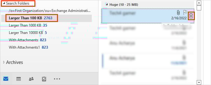 Zodra de zoekopdracht is voltooid, kunt u alle gefilterde grote e-mails zien onder de Zoekmappen dropdown.U kunt de muisaanwijzer op elk bericht afzonderlijk plaatsen en op het pictogram Prullenbak klikken om het te verwijderen.