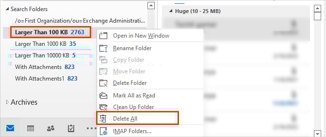Maar als u een groot aantal onnodige e-mails heeft, kan ze allemaal tegelijk leegmaken. Vouw hiervoor de vervolgkeuzelijst Zoekmappen in de linkerzijbalk uit en klik met de rechtermuisknop op de map Groter dan