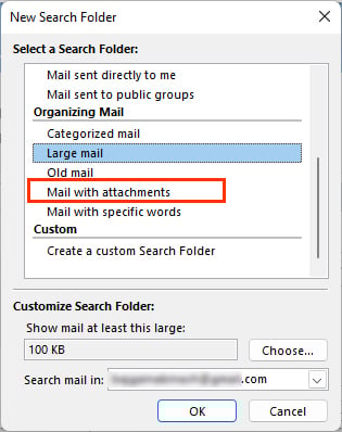Om alle e-mails met bijlagen eruit te filteren, selecteert u de optie E-mail met bijlagen op de prompt Nieuwe zoekmap.